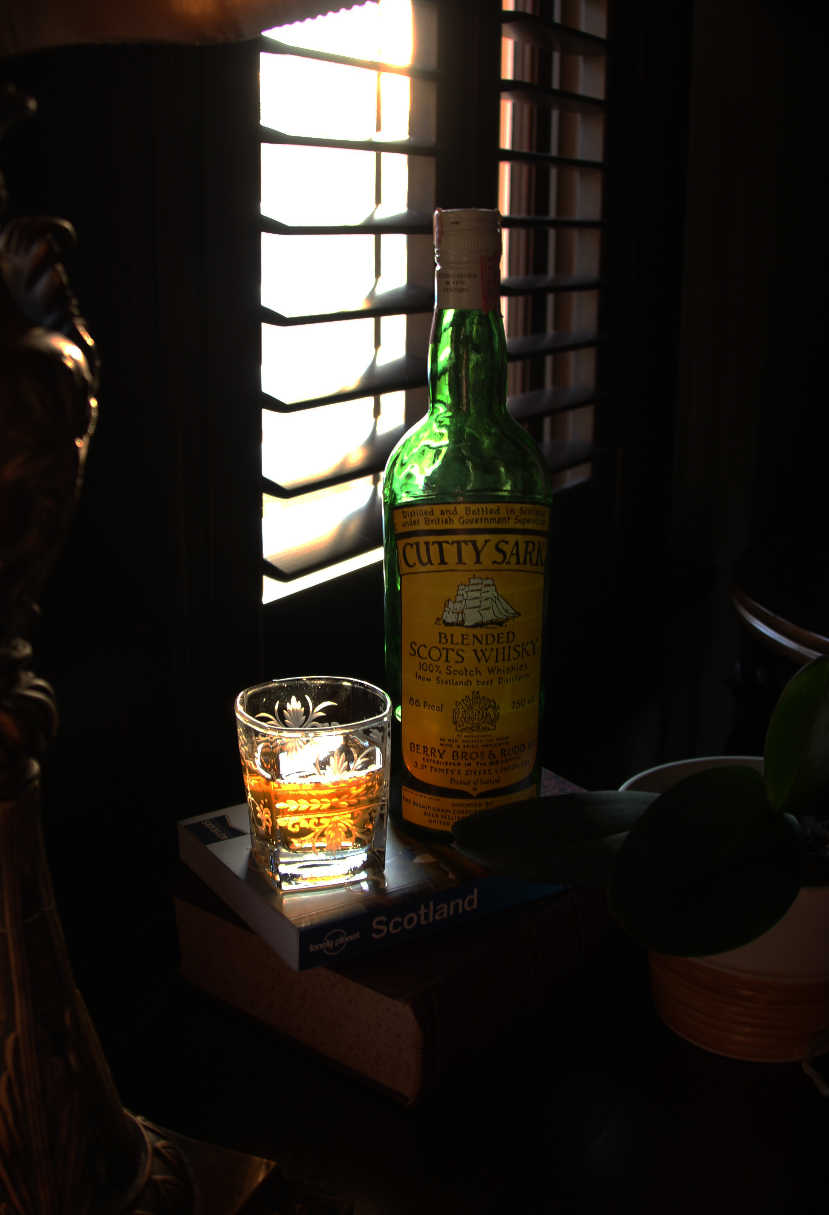 The lamp and the small orchid plant filled the corners of the shot, and I think it came out pretty nice. Let me know what you think. Or what you drink, if you’re so inclined. I’m actually more of a Gin connoisseur myself. The old bottle of scotch was a gift from a recently departed friend. I don’t think she was a scotch drinker either, because the bottle is super old.
